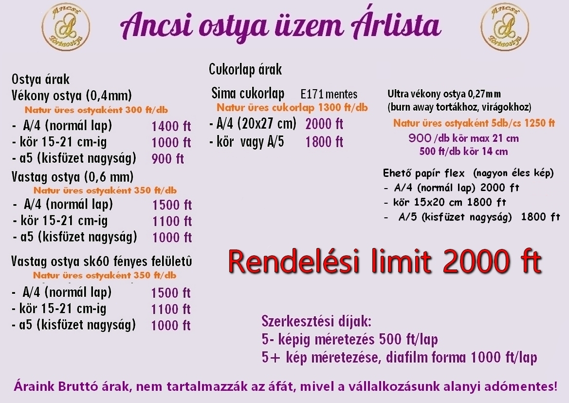 Áraink forintban értendők. Az áraink Bruttó árak, melyek nem tartalmazzák az Áfát, vállalkozásunk adómentes!